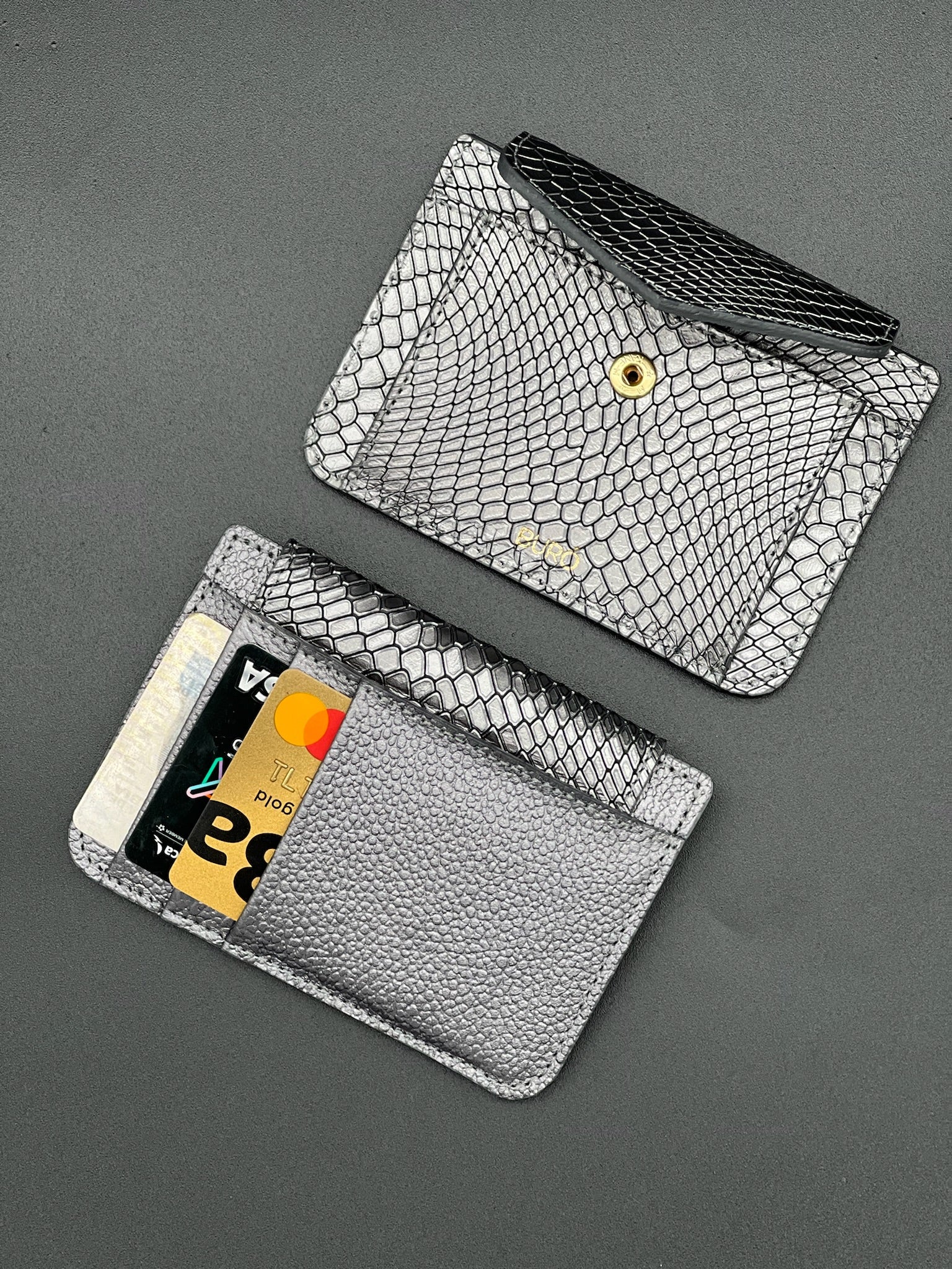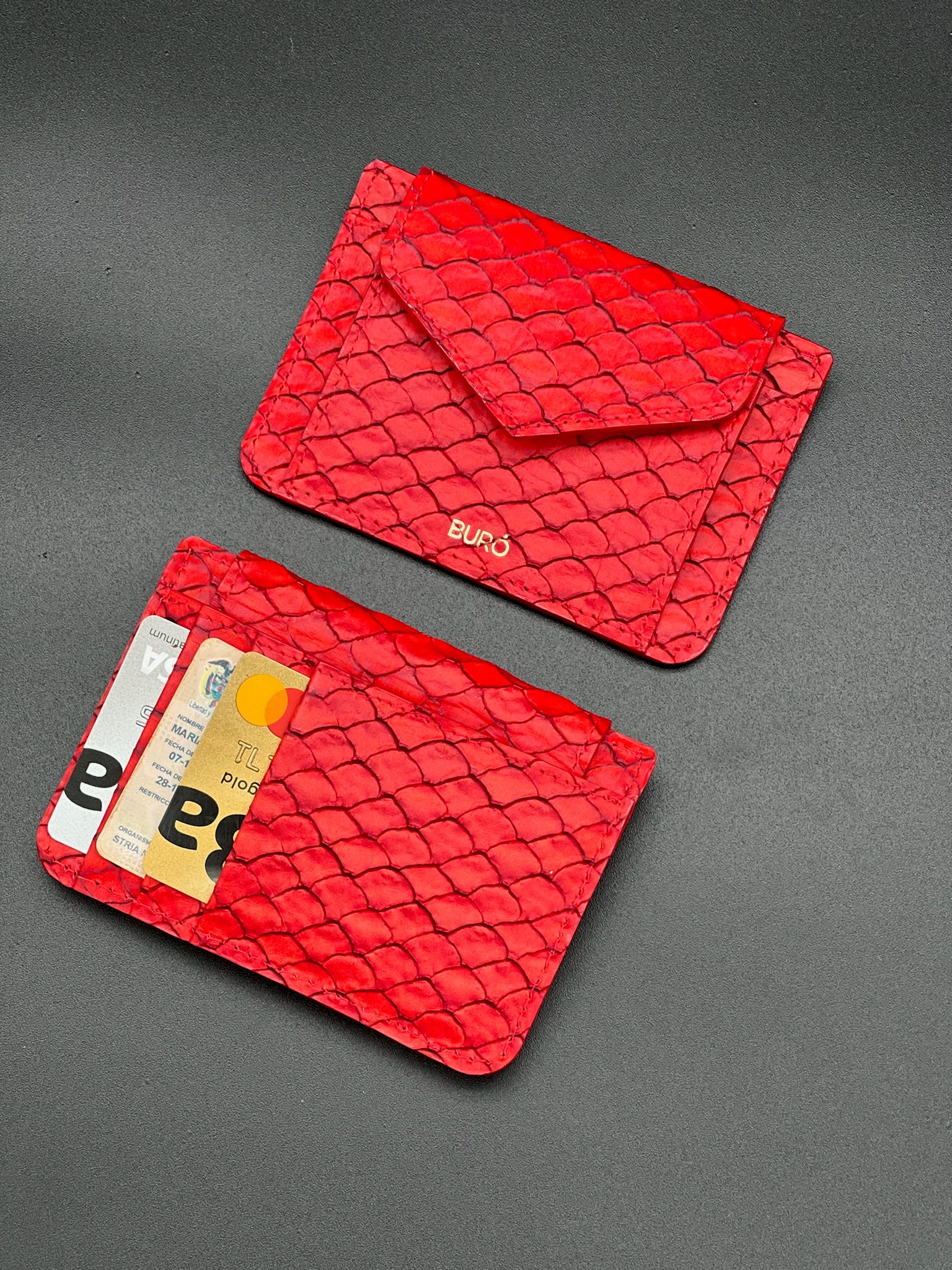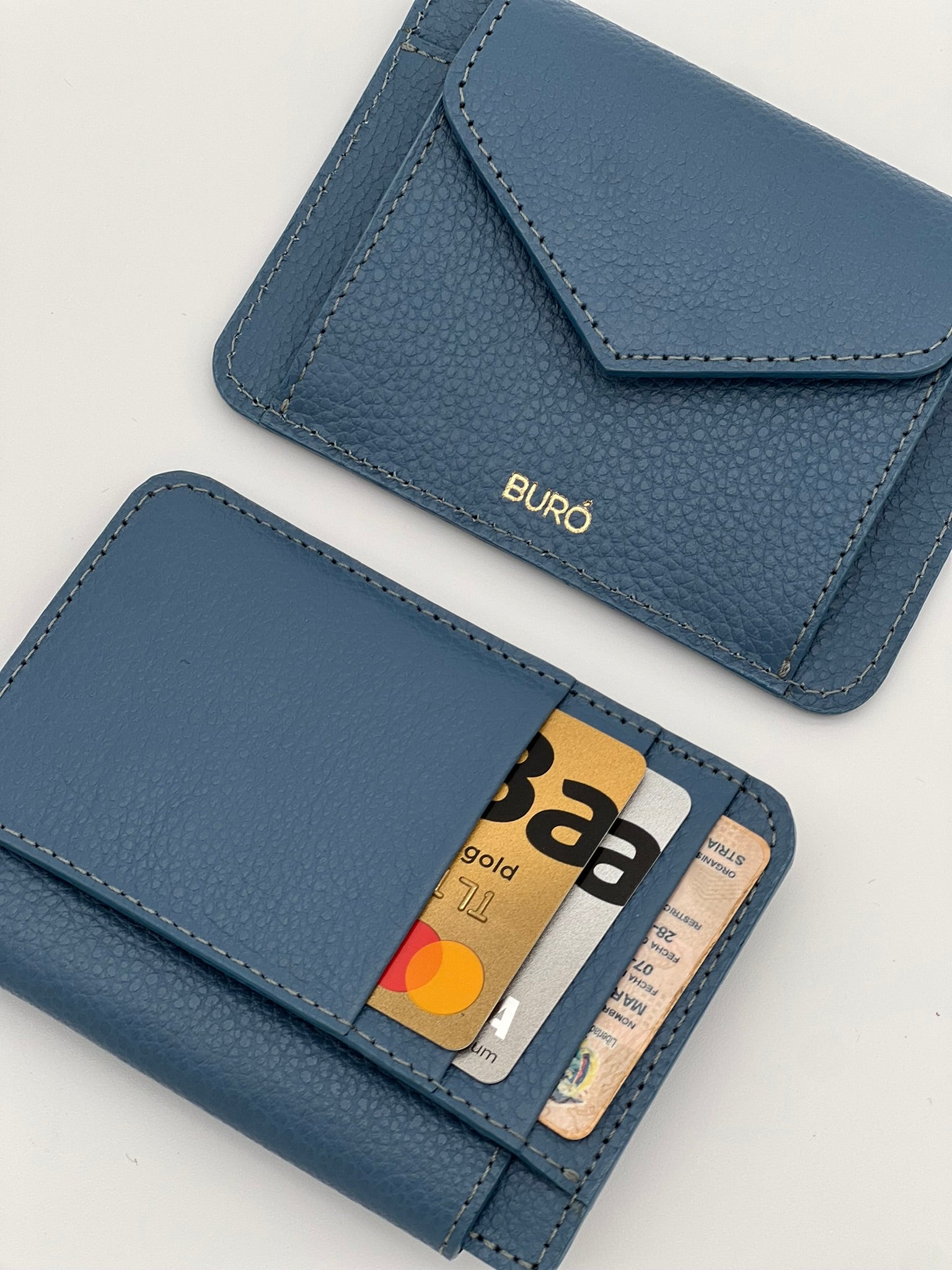 Tarjetero. Espacio para 4 tarjetas, monedero y bolsillo auxiliar para billetes.