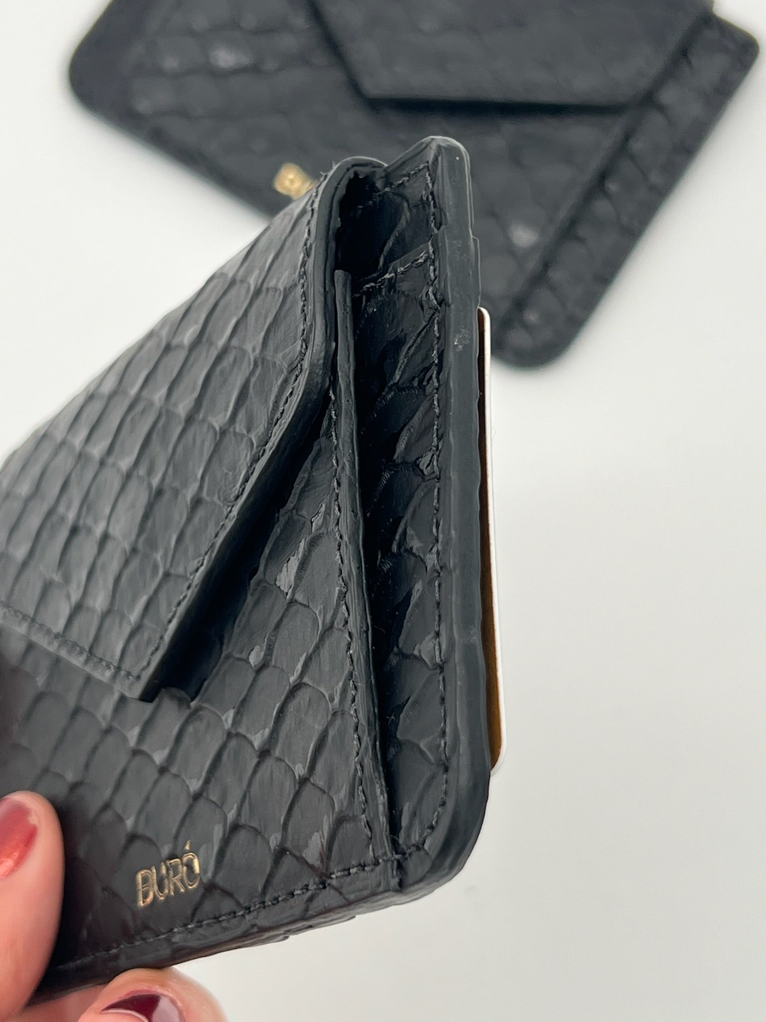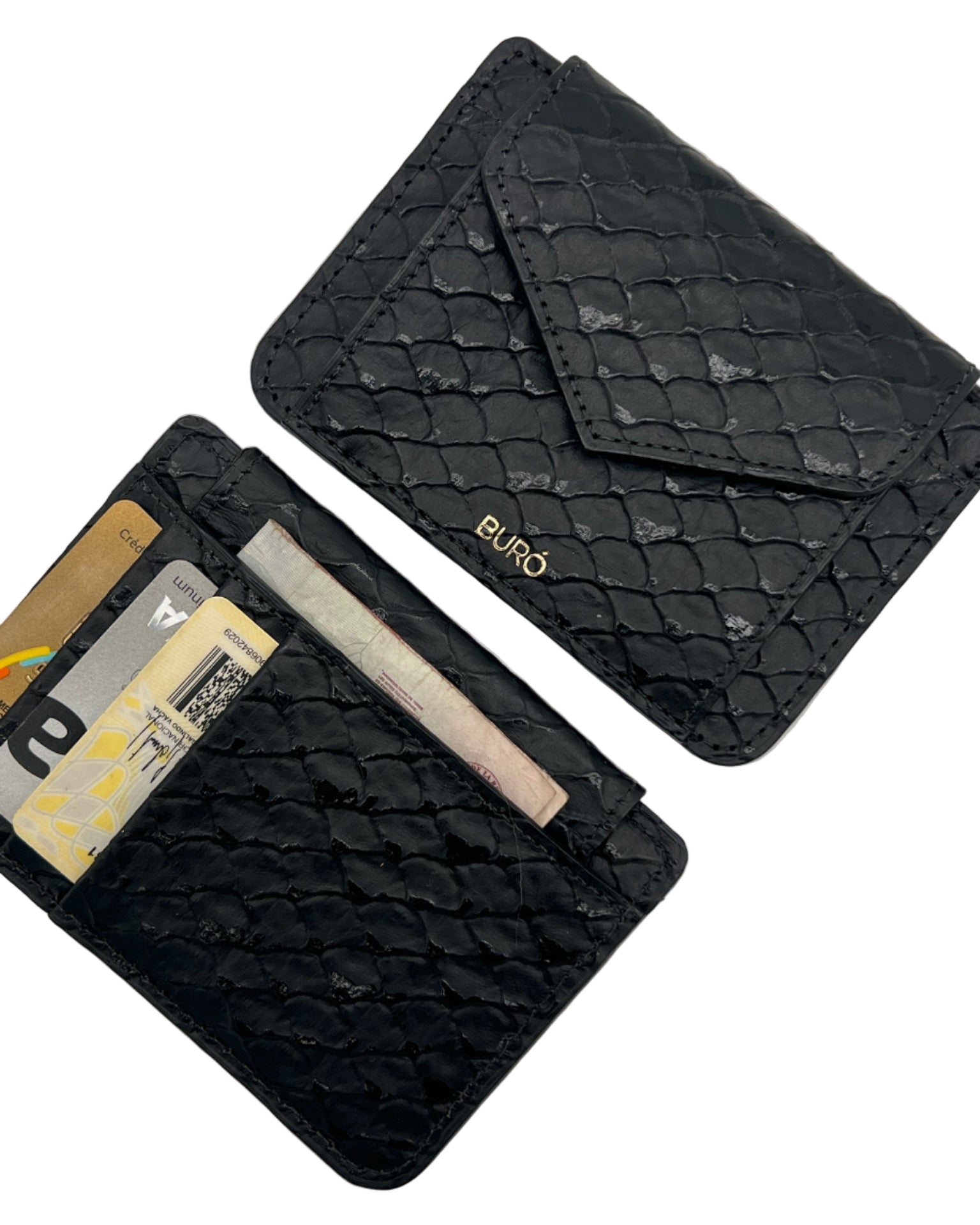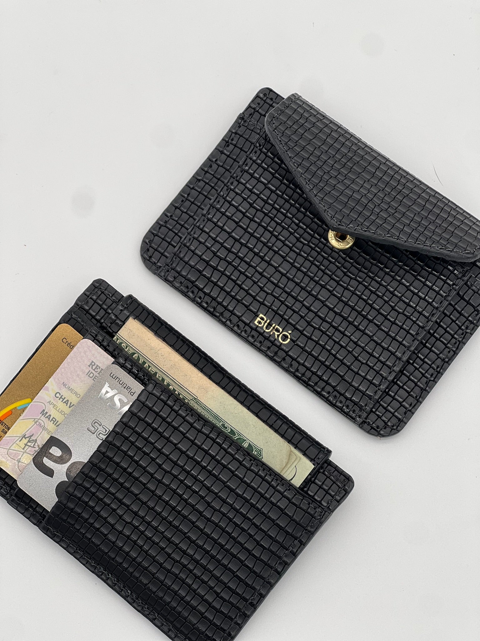 Tarjetero. Espacio para 4 tarjetas, monedero y bolsillo auxiliar para billetes.